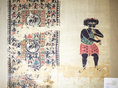 من الكتان والصوف، وهي تصور زَّماراً وإلى اليسار لوحة رأسية تتكون زخارفها من