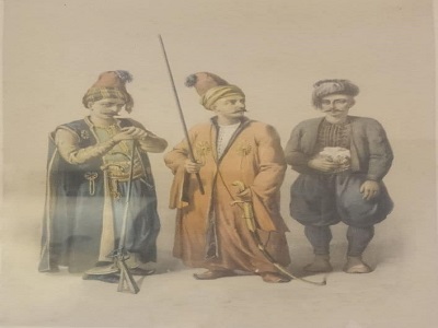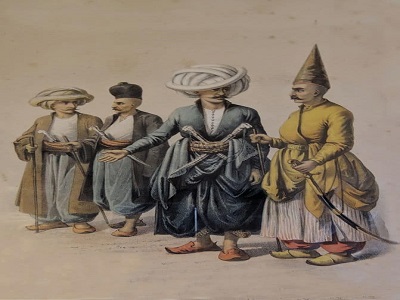 الشرطي في العصر العثماني مثال للوحة فنية لثلاثة أشخاص هم (جندي، قائد عسكر