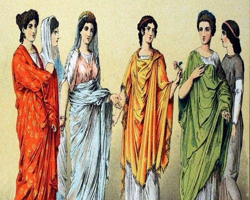 ملابس مشابهة للأزياء اليونانية، فارتدى النساء فساتين طويلة ومزخرفة، بينما