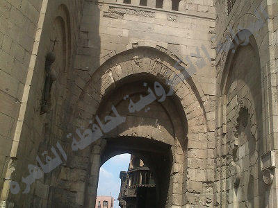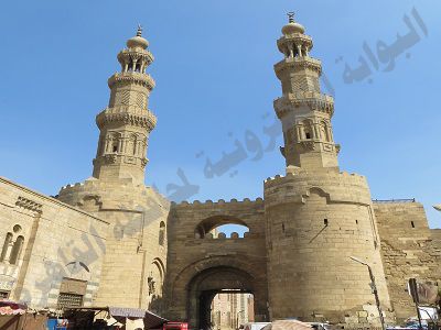ويطلق عليه العامة "بوابة المتولي" ويكاد يجمع المؤرخون على أن السبب في تلك التسمية يرجع إلى متولي الحسبة الذي كان يجلس على هذا الباب حتى يحصّل الضرائب من كل ما يدخل ويخرج من القاهرة وخصوصاً أن هذا الباب كان يواجه العواصم القديمة لمصر (القطائع – العسكر – الفسطاط)، ويتكون من كتلة بنائية ضخمة عرضها 25.72 متراً وعمقها 25 متراً وارتفاعها 24 متراً عن المستوى الاصلي للشارع، ويتكون الباب من برجين مستديرين يبرز ثلث الكتلة البنائية خارج السور، ويتوسط البرجين ممر مكشوف يؤدي إلى باب المدخل ويرتفع البرجان إلى ثلثي الارتفاع في بناء مصمت ويأتي في الثلث العلوي من كل منهما حجرة دفاع يغطيها قبو طولي يتقاطع مع قبو عرضي.