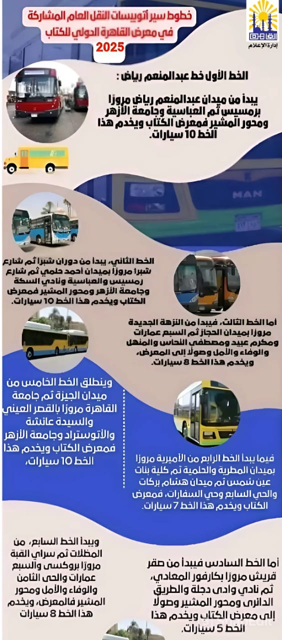 من وإلى مقر المعرض، حيث سيتم توفير 58 أتوبيس قابلة للزيادة لخدمة الزوار تغطي معظم مناطق القاهرة بالإضافة للخطوط