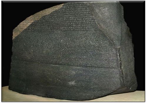 حجر رشيد هو نصب من حجر الجرانودايوريت مع مرسوم صدر في ممفيس بمصر في 196 قبل الميلاد نيابة عن الملك بطليموس الخامس، يظهر المرسوم في ثلاثة نصوص: النص العلوي هو اللغة المصرية القديمة الهيروغليفية المصرية، والجزء الأوسط نص الديموطيقية، والجزء الأدنى اليونانية القديمة، لأنه يقدم نفس النص في جميع النصوص الثلاثة "مع بعض الاختلافات الطفيفة بينهم"، ليكون الحجر مفتاح الفهم الحديث للهيروغليفية المصرية.