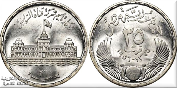 السويس، وعملة فضية بقيمة خمسون قرشا في عيد الجلاء عام 1956.