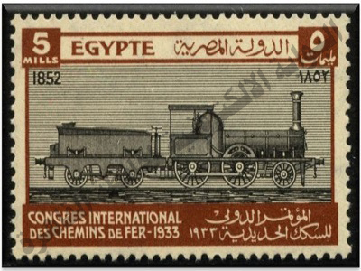 المصرية ـ 5 مليمات ـ المؤتمر الدولي للسكك الحديدية 1933) والطابع باللون البني ، وتم طباعة 202 ألف نسخة منه بسعر 5 مليم.